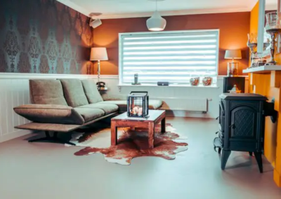 Het centrum van de woonkamer is ongetwijfeld de open haard. In een gezellige woning mag een knetterend haardvuur natuurlijk niet ontbreken. Bouwheer: De haard is in dit gure winterweer een absolute topper. Voor ons kleinste gezinslid een vaste plek om zich te nestelen bij koud en nat weer. Na een heerlijke avond cocoonen waarbij de open haard steevast aanstaat, durven er wel wat houtschilfers te liggen op de vloer. Ook hierbij is de gietvloer dan een absolute zaligheid. Deze is in een mum van tijd weer netjes na een simpele rondgang met onze antistatische swifferdoek.