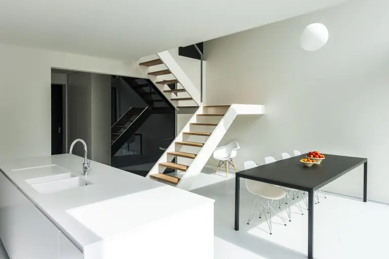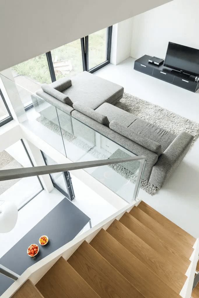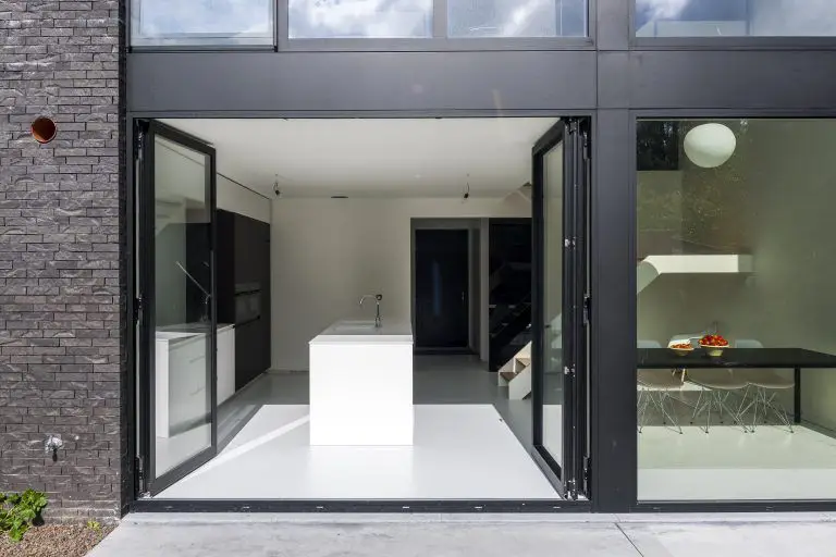 Een van de materialen waarvoor werd gekozen was een naadloze PU gietvloer. Deze loopt door in de woning hetgeen de eenheid tussen de ruimtes versterkt. “Een dubbelhoge glaspartij aan de achtergevel brengt natuurlijk licht tot diep in de woning. Via een vouwschuifraam krijgt de leefkeuken op het gelijkvloers een verlengde op het terras.”