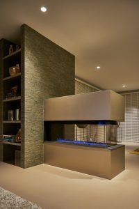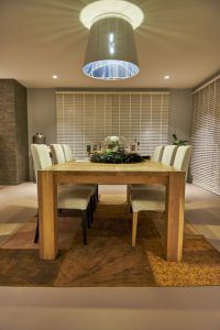 De eetkamer met aansluitend de woonkamer. De centrale haard vormt als het ware de scheidingslijn tussen beide plaatsen, en tovert het geheel om in een zeer aangename, warme ruimte: