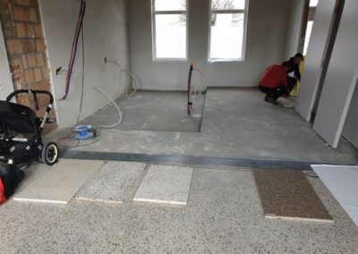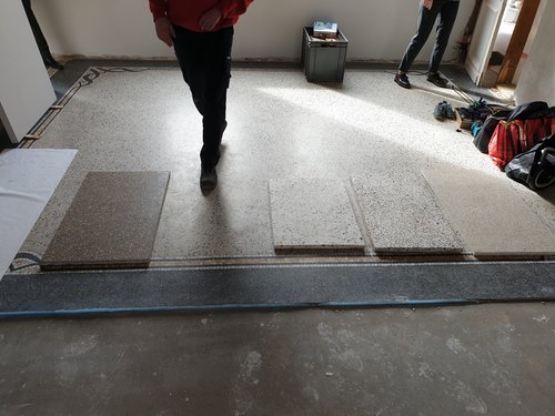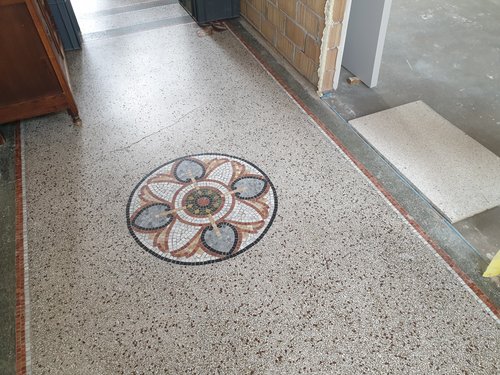 Voor dit project plaatste we een Rezzino vloer tussen een bestaande terrazzo vloer. Er werd door de klant voor dit materiaal gekozen na een bezoek aan onze showroom. Daar konden ze immers de vloer op een groter oppervlak bewonderen en in een representatieve omgeving. Hierdoor kon men een betere inschatting maken van het uiteindelijk resultaat.