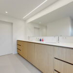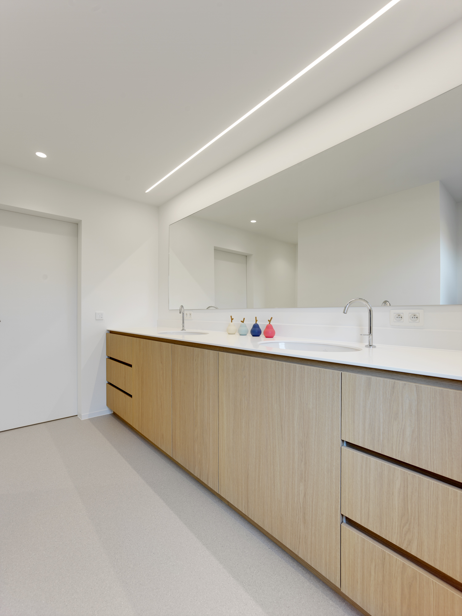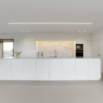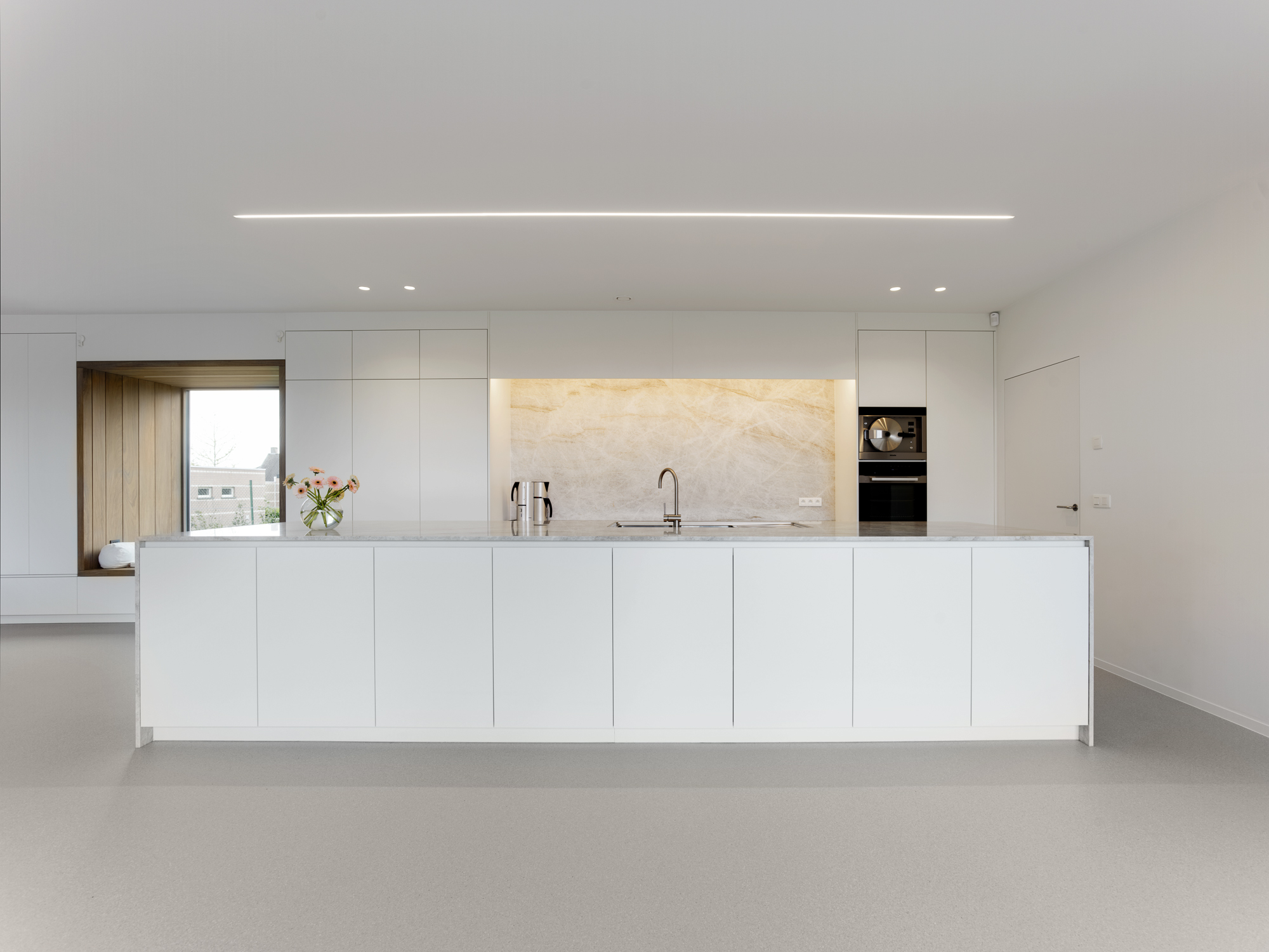 De troffelvloer vormt de perfecte basis voor dit interieur, waarin wit maatmeubilair, natuurhouten accenten en veel lichtinval elkaar versterken. De natuurlijke uitstraling van de vloer brengt rust en harmonie in de woning en zorgt voor een tijdloze, moderne look die perfect past bij de persoonlijke stijl van het gezin.